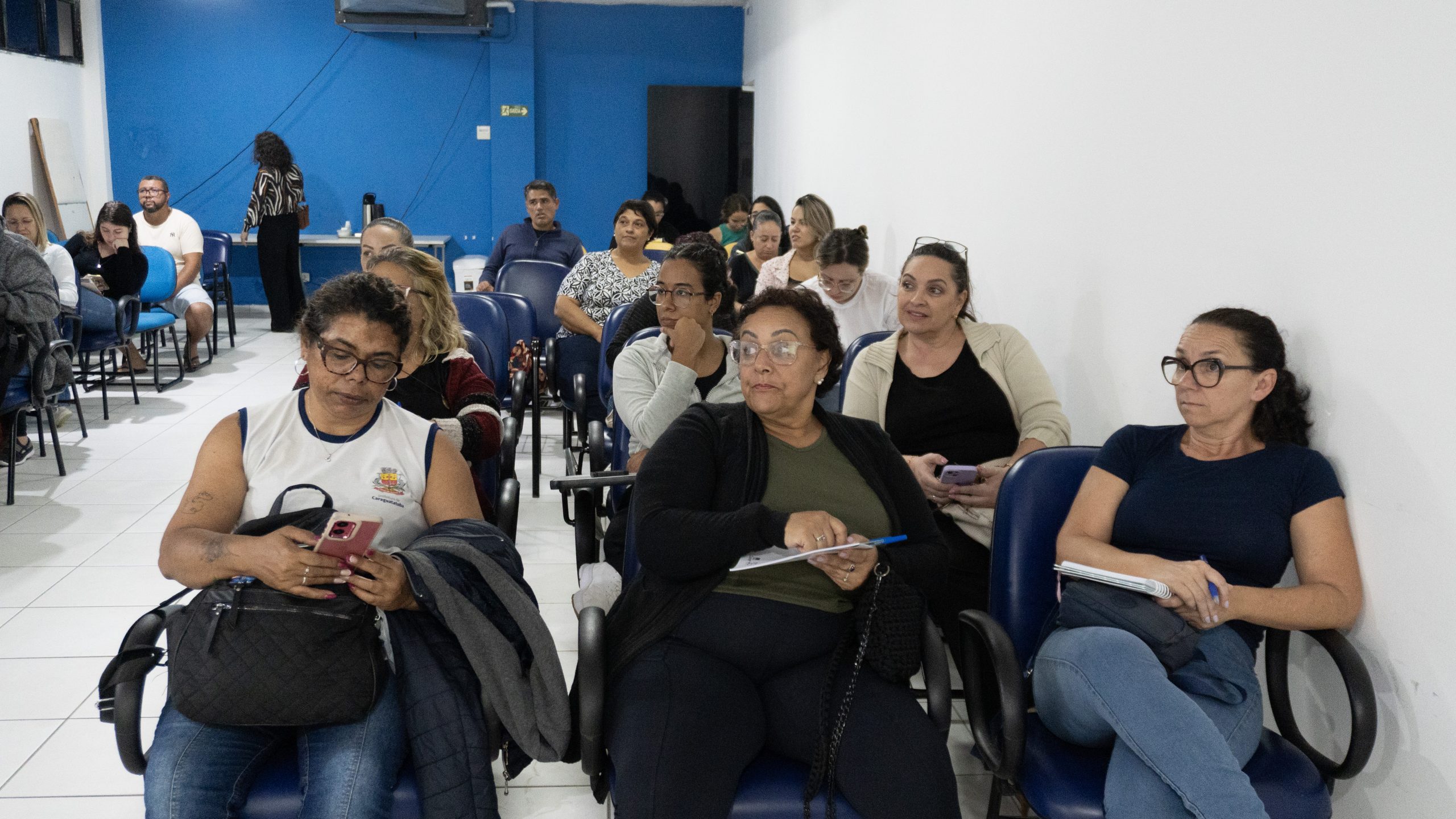 #PraTodosVerem Salão de reuniões da Sepedi. Alunas e alunos de diferentes idades estão sentados e assistem à aula.