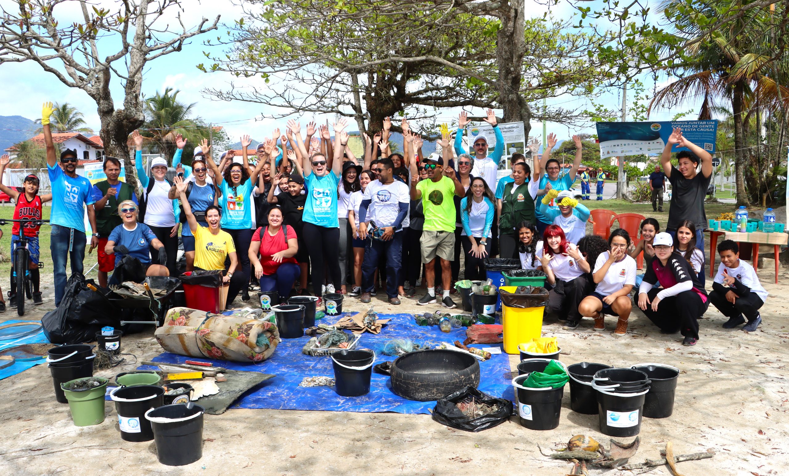#PraTodosVerem – Multirão de limpeza na Praia do Porto Novo, em Caraguatatuba, com voluntários e adolescentes.