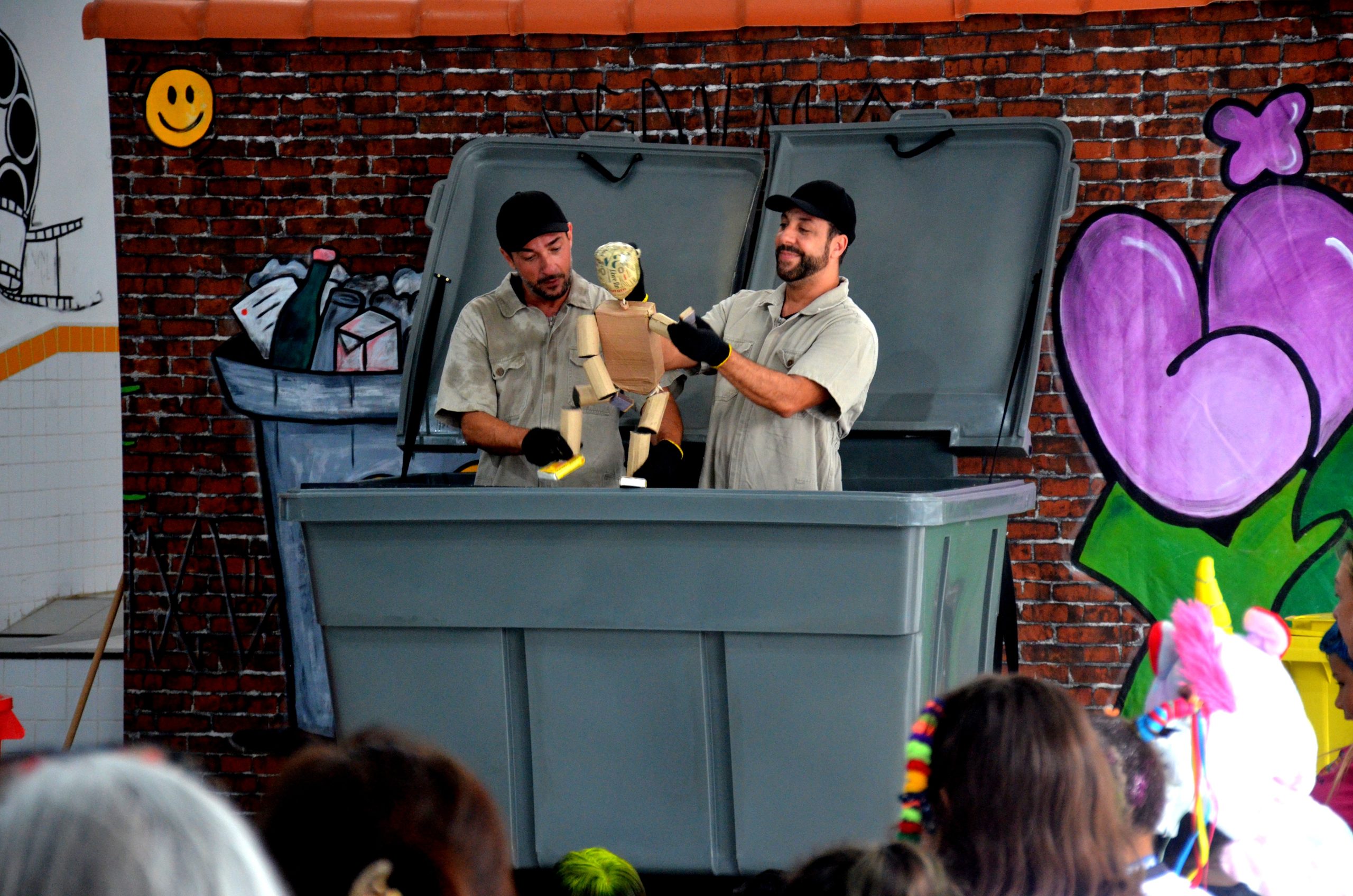 Voltada para crianças de 5 a 12 anos, a peça mostra a história de dois amigos que trabalham como coletores de lixo e descobrem, entre os materiais descartados, novas formas de criar bonecos, brinquedos e objetos lúdicos. A partir dessas descobertas, o espetáculo propõe uma reflexão sobre o destino do lixo e o impacto do consumo no meio ambiente.