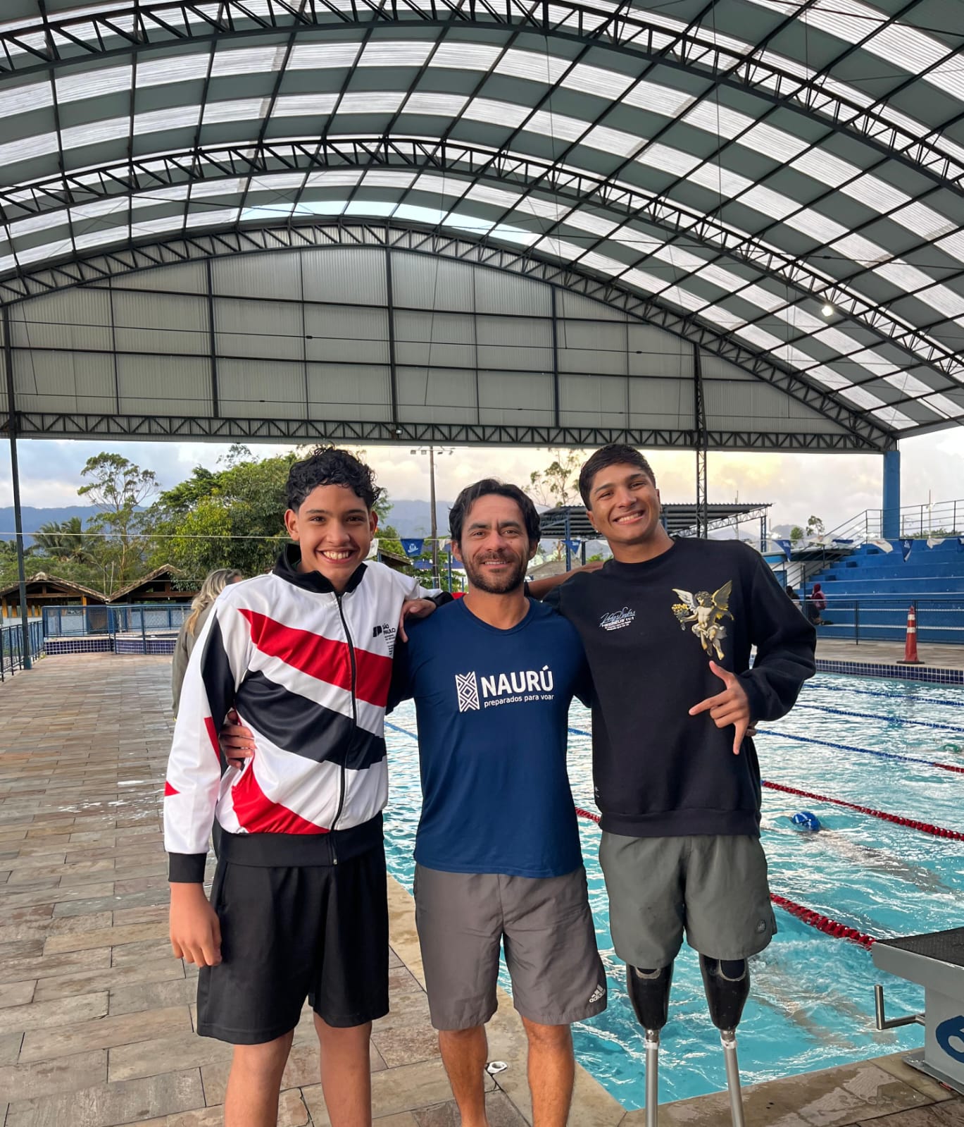 #PraTodosVerem Da esquerda para a direita, o paratleta Arthur Demétrio, o técnico de natação , Thiago Intrieri, e o paratleta Nicolas Silvestre.