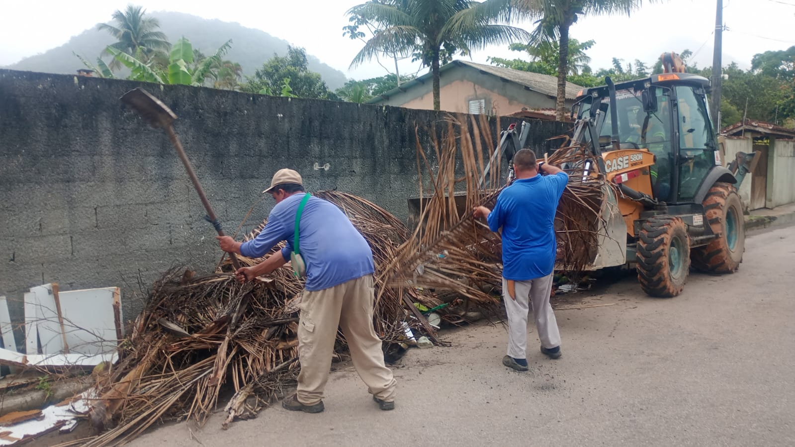 #PraTodosVerem: Dois funcionários recolhem restos de podas descartados irregularmente em rua do Massaguaçu, com apoio de uma retroescavadeira (Foto: Divulgação/PMC)
