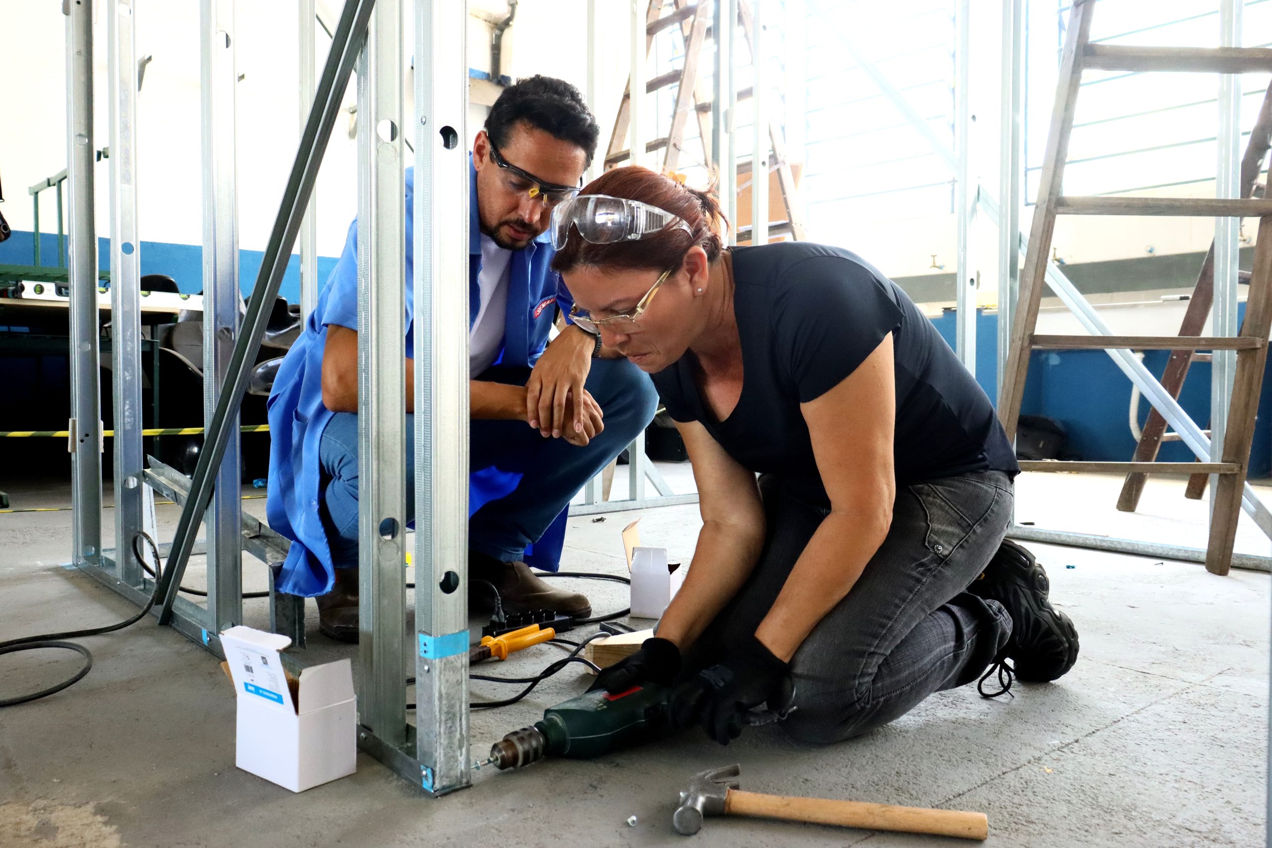 #PraTodosVerem A aluna Juliana Neves insere um parafuso na estrutura de metal com uma parafusadeira. O instrutor Ennio Ribeiro, ao lado, observa a ação.