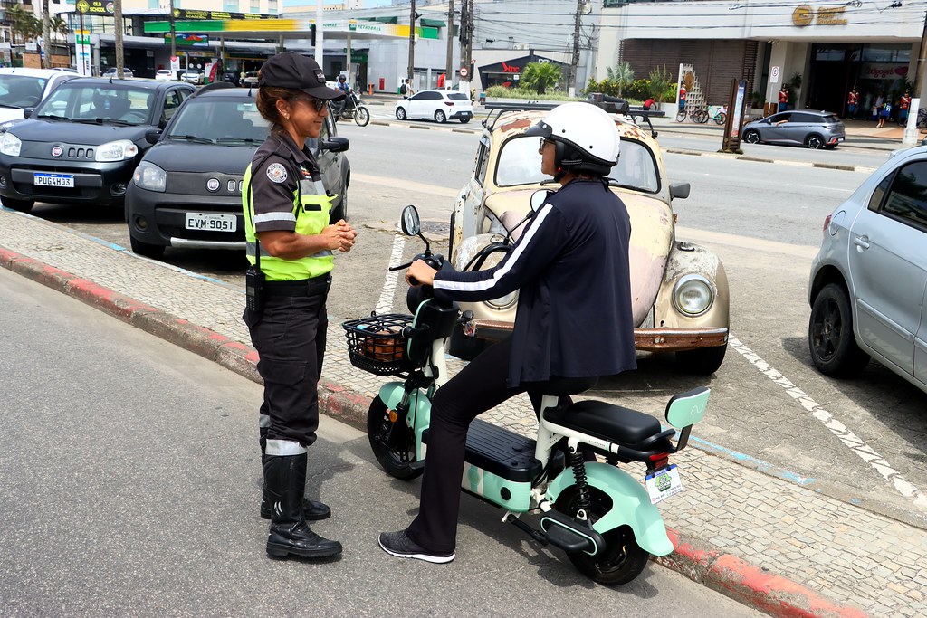 #PraTodosVerem: Agente de fiscalização de trânsito orienta condutora de ciclomotor em trecho da ciclovia, na Praça da Cultura (Foto: Luis Gava/PMC)