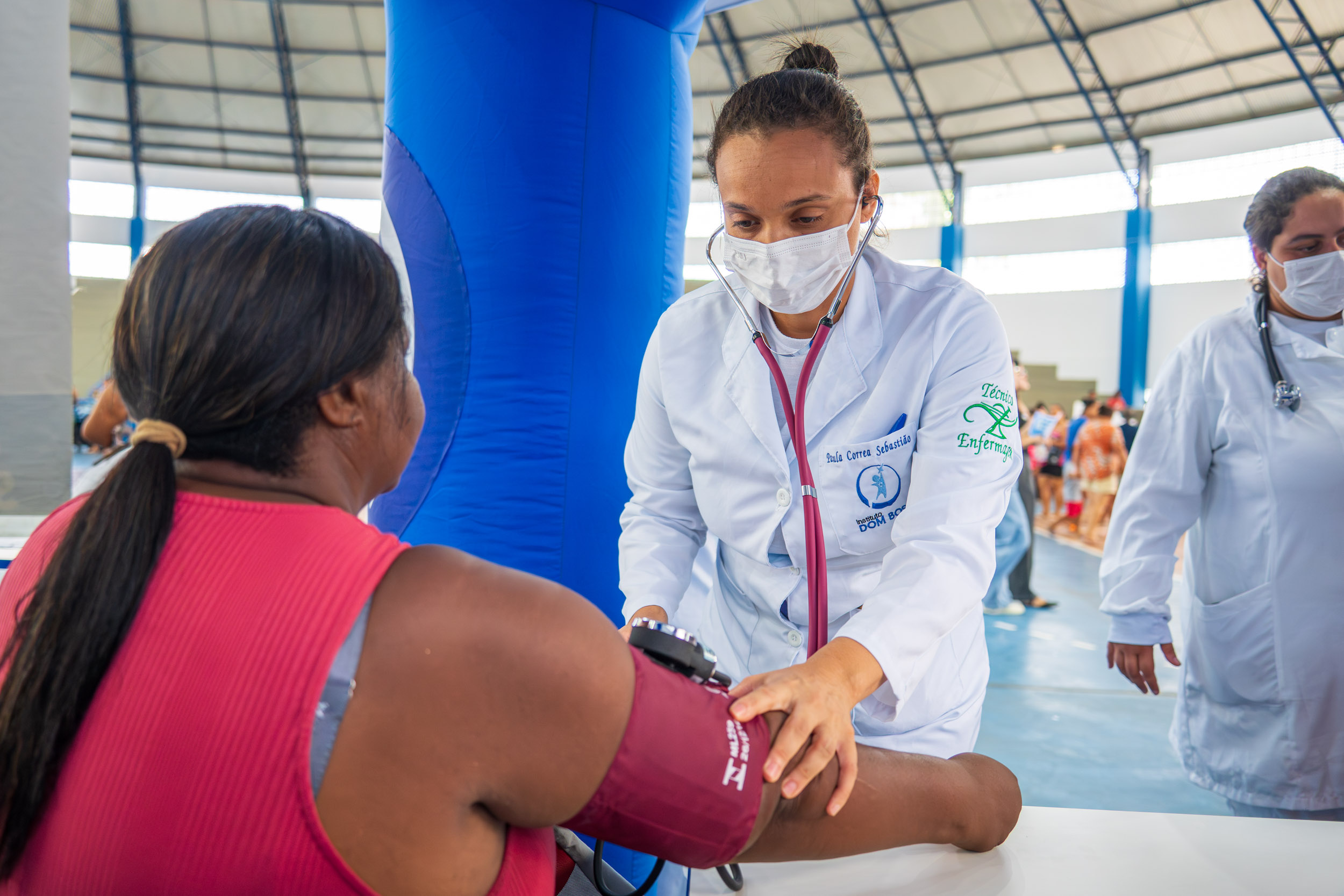 #PraTodosVerem Uma técnica em Enfermagem faz a aferição de pressão de uma mulher que está sentada para atendimento