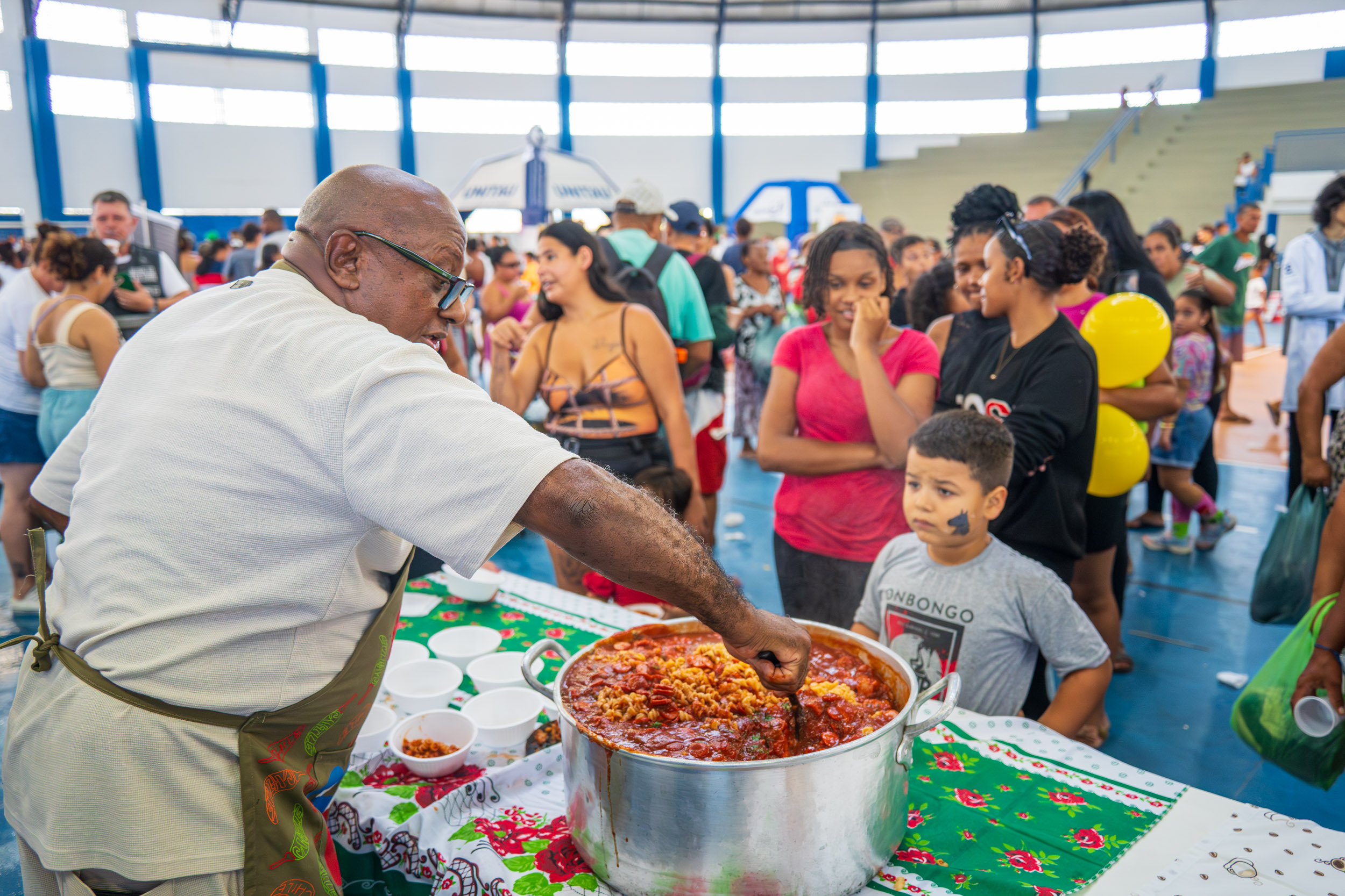 Servidores de todas as secretarias proporcionaram acolhimento, encaminhamentos e orientações aos munícipes, e coordenaram brincadeiras com as crianças nos brinquedos infláveis, no pula-pula e no espaço para contação de histórias. Também houve mesa de frutas e um almoço comunitário com a tradicional macarronada dominical.
