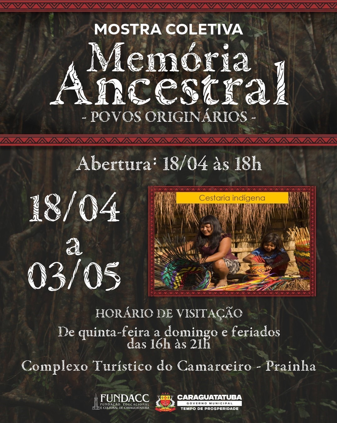 A Fundação Educacional e Cultural de Caraguatatuba (Fundacc) realiza neste sábado (18/4), às 18h, no Complexo Turístico do Camaroeiro (mirante), a abertura oficial da mostra coletiva de artesanato e artes plásticas “Memória Ancestral – Povos Originários”.
