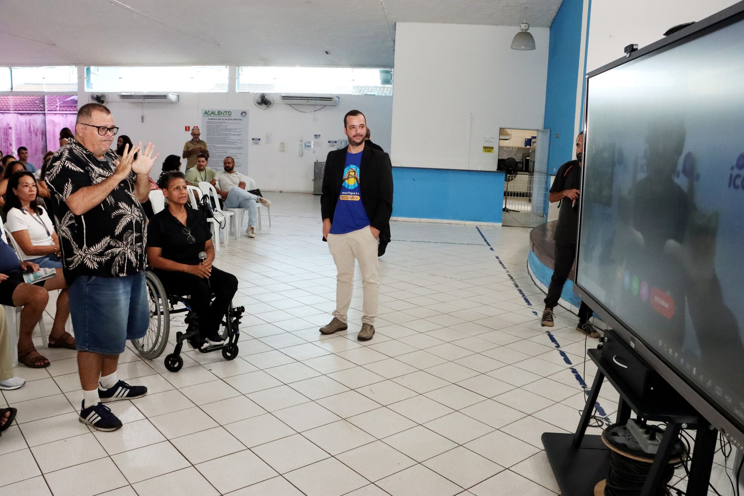O representante da empresa de tecnologia assistiva ICOM, vencedora da licitação da ICOM, Diego Carneiro, esteve presente e fez uma demonstração para os presentes de como funciona a plataforma. Houve a simulação de um atendimento entre um servidor público e uma pessoa surda com o suporte da central da empresa.